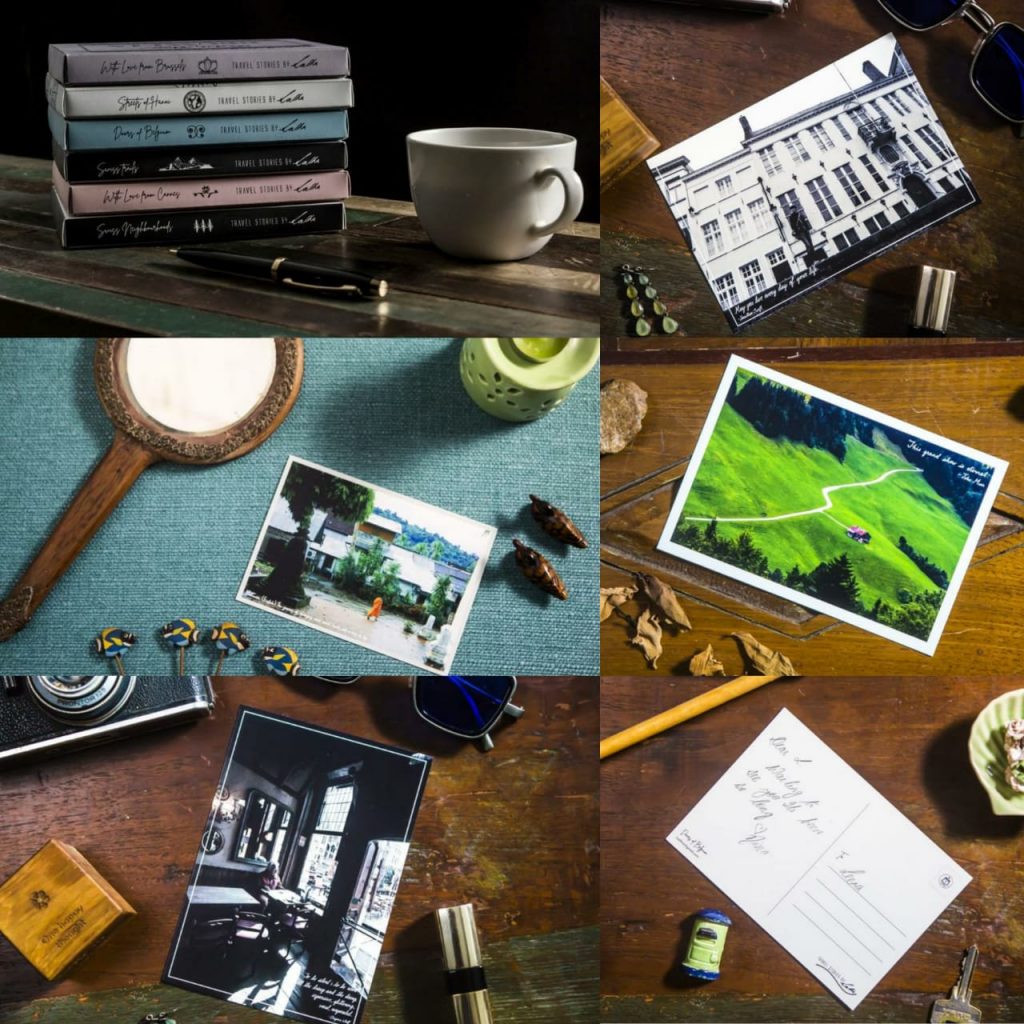 In the series there are six different sets of photo cards named : With Love from Brussels , Streets of Hanoi , doors of Belgium , Swiss Trails , With Love from Cannes & Swiss Neighborhood . Each set, brings forth a different thematic mood